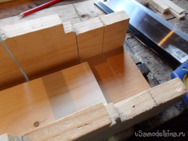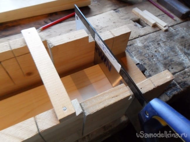 В стусле, закрепленном в верстачных тисках, отпиливаем с торцевых сторон лишние части горизонтальных полок. Длина получилась равной 43 см.