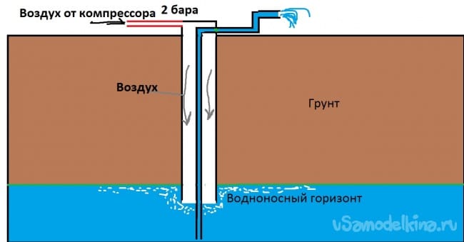 Но тут появляется вопрос, не вытеснит ли воздух воду из водноса?))) Какова вероятность этого события? Я думаю, небольшая. Воздуху тоже вроде деваться некуда, вполне возможно, что под землей получится получить стабильное повышенное давление и вытеснить воду выше, откуда ее можно будет "сосать" наружным насосом.