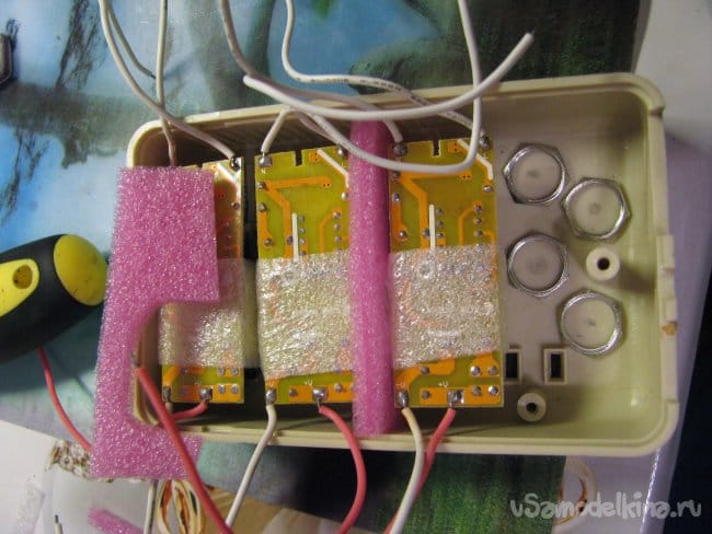 В итоге, три драйвера я решил расположить вряд, отделяя их друг от друга прокладками, вырезанными из вспененного полиэтилена и попутно думая о том, как расположить четыре гнезда для подключения цепочек светодиодов.
