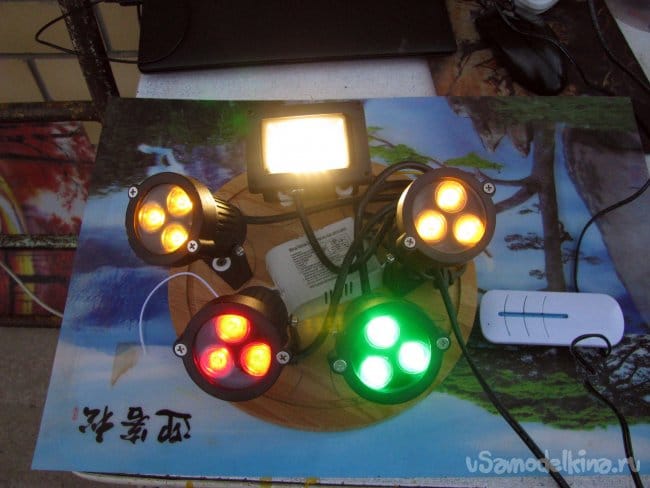 Более года у меня в доме эксплуатировалась вот эта нехитрая конструкция. Это пять цветных прожекторов по 10 ватт каждый, укрепленные на разделочной доске. В её центре, трехканальный блок радиоуправления.