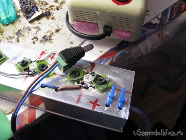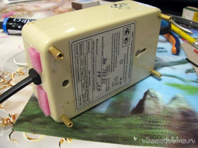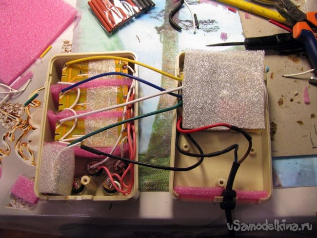 Шнур 220 вольт был взят из моего предыдущего проекта. Пустые окна в нижней половинке корпус заклеены вырезками из того же вспененного полиэтилена.