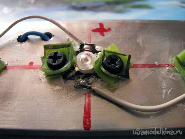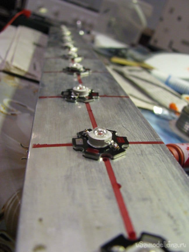 Вначале, я решил ориентировать выводы светодиодов относительно обозначениям плюса и минуса на радиаторах, но заметил, что корпус светодиода скрывает эти значки и решил не париться и просто обозначить красным маркером положительный вывод получившийся сборки.