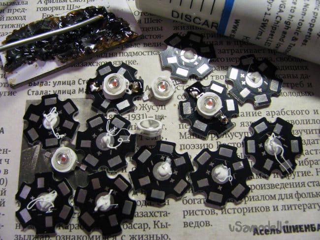 Звездочки пришли. В пояснении к ним, указывалось, что паять светодиоды следует на подогреваемой платформе, я попробовал на утюге – ничего не вышло.