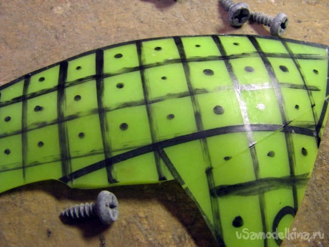 Это виниловая оболочка от мяча, который был использован при изготовлении еще одного плафона по типу моего прошлого проекта. Каждую точку в центре, я проткнул острием пинцета.