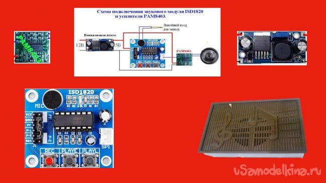 В своей самоделке я применил недорогую плату воспроизведения и записи звука на чипе ISD1820. На Алиэкспресс (ссылка) таких модулей огромный выбор. Звуковые модули можно применить в разнообразных самоделках- говорящие игрушки, звонки для входных дверей, голосовая озвучка сигналов, параметров в приборах, автомобилях, настольных часах и так далее.