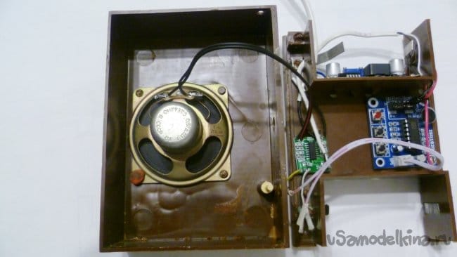 Схема собрана, платы установлены в корпус можно проверить все в сборе. С усилителем и отечественным динамиком звук получился громкий. Конечно более качественный звук можно получить если записывать через линейный вход. Для этого нужно подключить к разъему громкоговорителя резистивный делитель и через разъем джек 3,5мм подключать к источнику сигнала-телефон, компьютер и т.п. Можно записать речевые файлы с сайта ivona.com. Там синтезируется речь профессиональных дикторов. Набираете нужный текст и получаете красивый речевой файл.