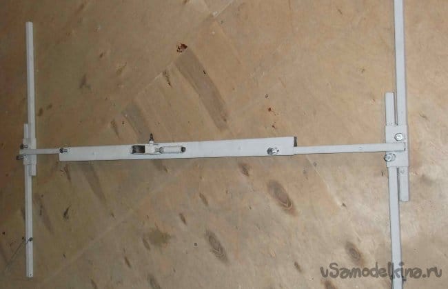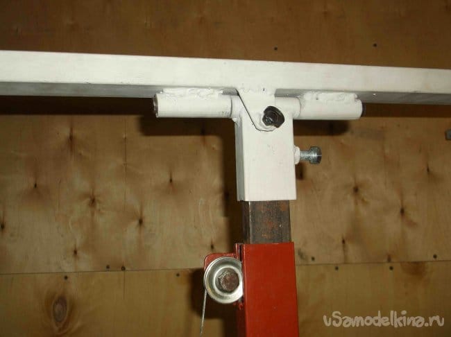 К нижней части стойки приварил две параллельные направляющие для более длинных стоек, над этими направляющими перпендикулярно приварил оставшиеся два отрезка трубы. Выглядит все это, мягко говоря, не эстетично, но дает возможность регулировать вылет распорок каждой по отдельности.
