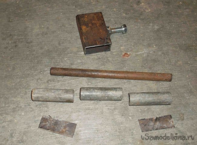 Для этого потребовались три отрезка полудюймовой трубы по 7 см, стальной стержень 25 см подходящего диаметра, который плотно входит во внутрь отрезков трубы. Две пластины для зазора между деталями, отрезок профильной трубы 25*50 который будет надеваться на выдвижную стойку и основная профильная труба 25*50 длинной 80 см для держателя листа гипсокартона. Процесс сборки видно из фото.