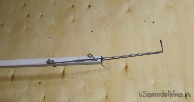 Во внутренней трубе отступив от нижнего края 35 см (отступ служит для предотвращения полного вылета внутренней тубы при подъеме), просверлил отверстие диаметром 5мм для тросика. Продел трос от стеклоподъемника через отверстие вовнутрь трубы, на конце тросика сделал петлю и дополнительно зажал болтиком, так чтоб трос невозможно было вынуть обратно через отверстие.