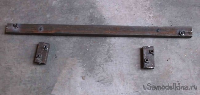 Основную трубу разделил перемычками по торцам и отступив от краев трубы по 20 см просверлил по центру отверстия, установил внутрь трубы отрезки гвоздей и зафиксировал их сваркой. Это сделано для устранения люфта двух внутренних труб 20*20 длинной 80см, которые будут перемещаться внутри. Для фиксации внутренних профилей на внешней трубе по краям приварил гайки на заранее просверленные отверстия, как это описывал ранее. Аналогично разделил перемычками и приварил гайки к двум отрезкам длинной по 10 см профильной трубы 25*50. Внутри этих профилей будут фиксироваться трубы 20*20 длинной 55 см, все соединения имеют независимую регулировку.