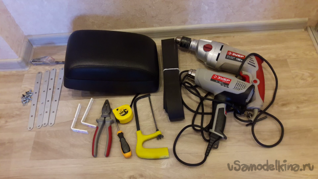 5) Теперь на снятый подлокотник с нижней стороны откручиваем два самореза, которые держат обшивку и на этом месте намечаем на уголках будущие отверстия и отпиливаем лишнее: