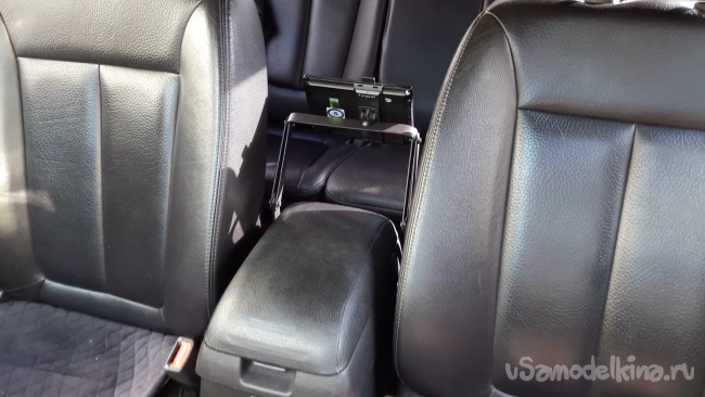 Такое крепление позволяет регулировать уровень наклона монитора и сгибать планки вперёд и назад, при этом монитор довольно жёстко держится (если конечно хорошо подтянуть болты с гайками) и не качается во время движения. Водителю и пассажиру на переднем сидении крепление не мешает. На этом всё, пока.