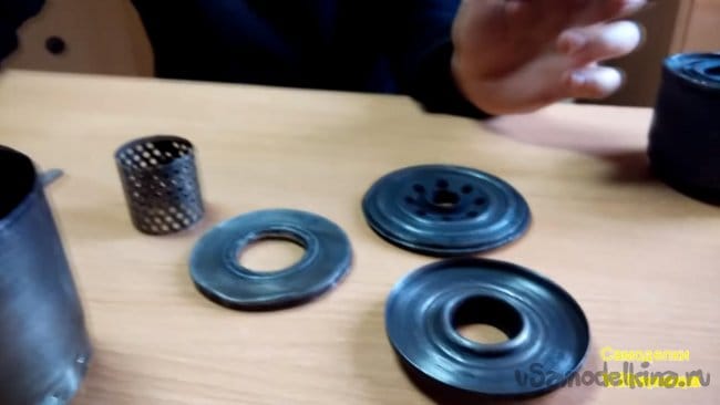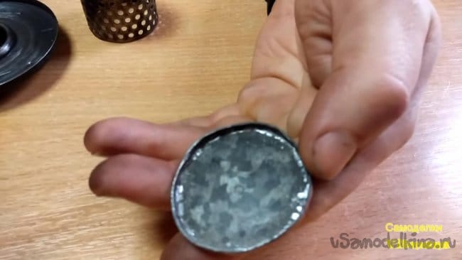 В принципе все составляющие части обогревателя готовы, осталось сделать крышку на сеточку и прикрутить ножки. Делаем крышку из куска оцинковки, при помощи ножниц по металлу вырезаем окружность с небольшим запасом под бортик и плоскогубцами загибаем края, чтобы они плотно прилегали к сетке. Также такую деталь можно сделать, если обстучать края заготовки на кругляке подходящего диаметра.