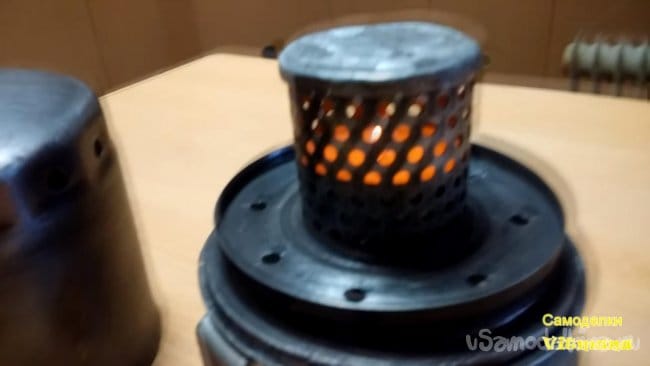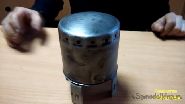 На данном этапе все детали для обогревателя готовы, теперь осталось их собрать воедино и проверить в действии это самодельное приспособление. На подставку с ножками из уголков устанавливаем второе донышко для размещения на нем свечки или сухого спирта, далее ставим свечку(сухой спирт), поджигаем и накрываем сеточкой с маленькой крышкой, затем закрываем всю конструкцию большой крышкой-корпусом.