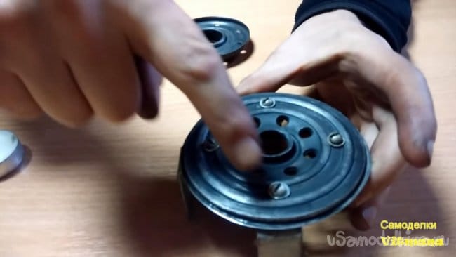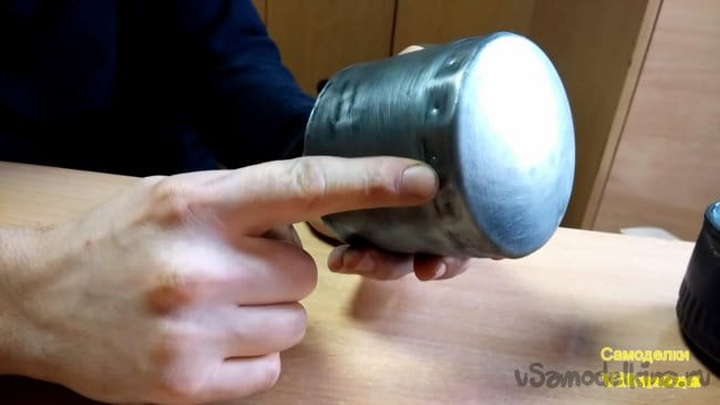 При работе на точильном станке будьте осторожны, соблюдайте меры безопасности, а также используйте защитные очки и респиратор. В итоге должно отсоединиться донышко от корпуса, если же детали все еще держатся, помогаем плоскогубцами, отгибая завальцованные края корпуса.