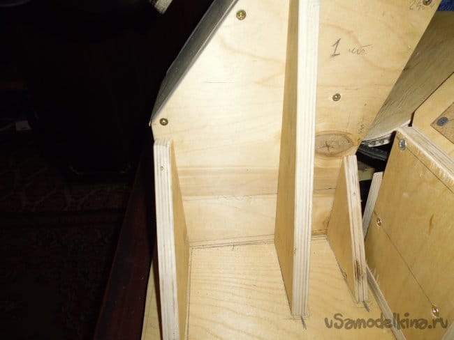 1. На боковые стенки шурупами прикручиваем по три ребра.