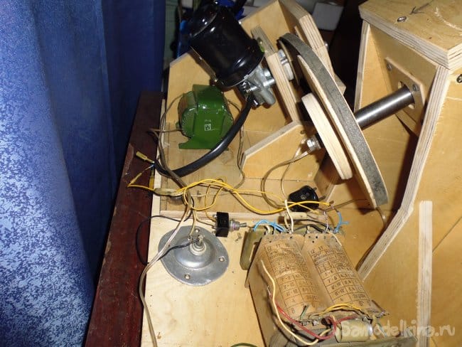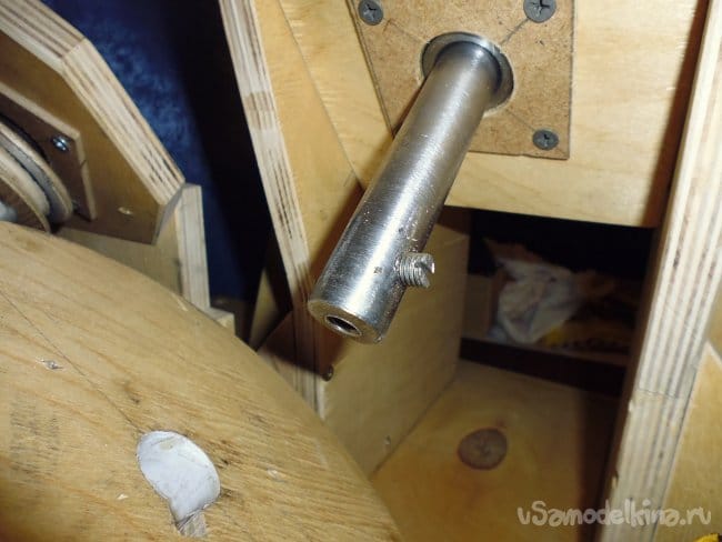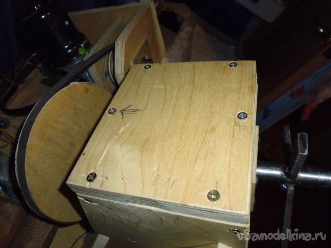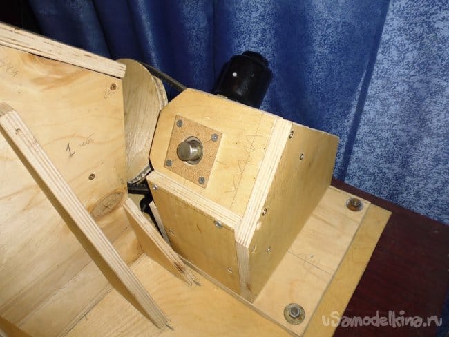 7. В подшипник задней стенки устанавливаем ось, крепим шкив.