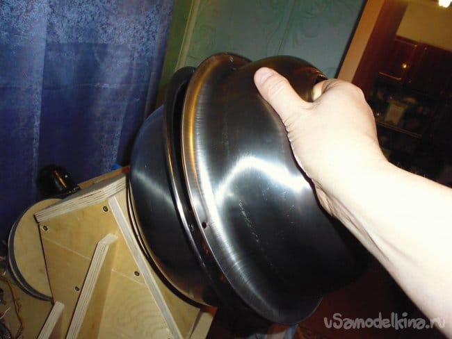 1. Циркулем на первом тазу определяем центр и намечаем отверстие диаметром 20 мм, напильником подгоняем отверстие под ось. Высверливаем крепежные отверстия через стальные полосы оси.