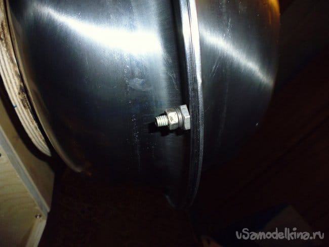 4. Через переднюю и заднюю стенки просовываем ось котла, по центру устанавливаем втулку крепления, крепим ее к оси болтом М8.