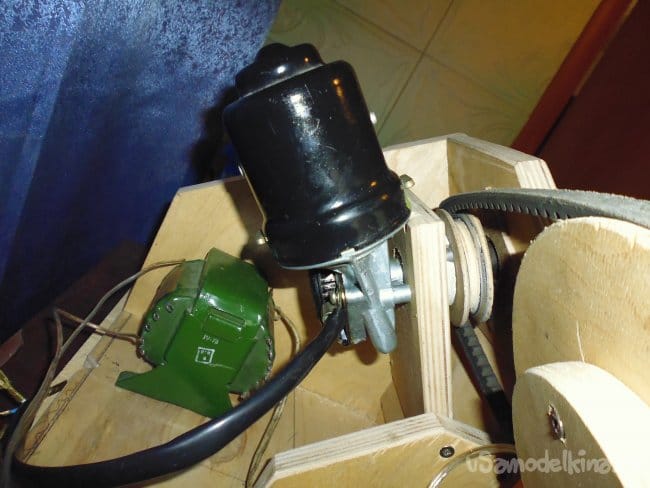 Машина работает от мотора стеклоочистителя с червячным редуктором (с автомобиля ВАЗ 2101), частота вращения 60 об/мин., для снижения скорости и увеличения мощности машины применена ременная передача соотношение шкивов 1/3.