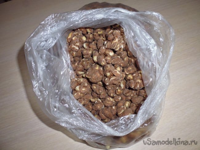 Засыпаю арахис, заливаю расплавленным шоколадом, шоколад долго не сохнет. Выясняется, что для быстрого застывания шоколада необходим холодный воздух. Арахис в шоколаде немного неказист, но зато очень вкусно, семья довольна.