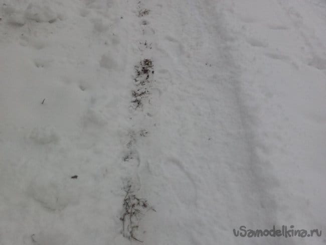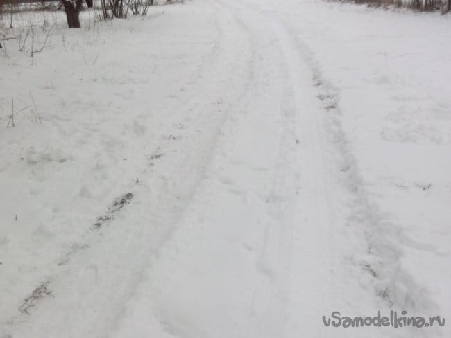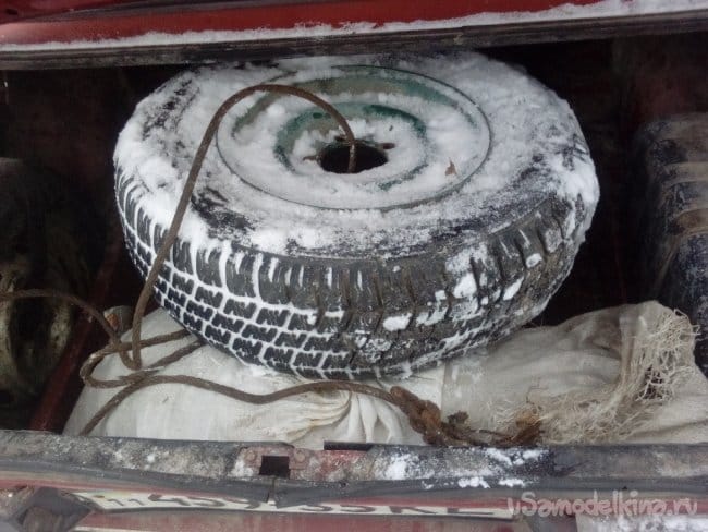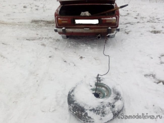 Решил вот привязать колесико от УАЗа для чистки. Чистит безупречно. Вожу колесо с собой, когда въезжаю в хутор, цепляю его сзади и тащу за собой по одной колее, в итоге чистится дорога. В багажнике еще таскаю песок для груза, плюс зимние колеса и Жигуль превращается в танк.