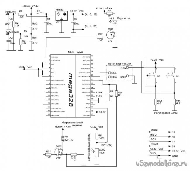 Про жало рассказано в прошлой статье. Полевики можно применить любые, для подсветки на ток до 100мА, для нагревателя больше 2А (лучше 5-50А). То же касается и стабилизатора на 3.3 вольта. Надо только смотреть, что бы распиновка и тип корпуса совпадал.