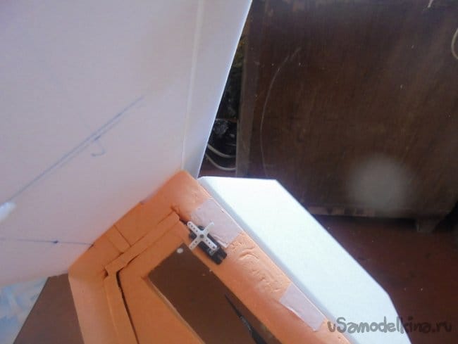 а сложенный вдвое отрезок зажимается между двумя слоями потолочки, предварительно сняв бумажную основу.