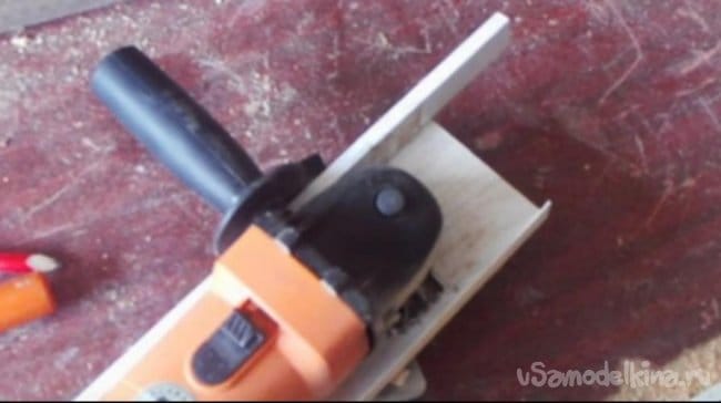 Идя, от простого к сложному. В начале решил к болгарке прикрепить алюминиевый профиль, который бы задавал бы один размер для всех брусков, но этого оказалось не достаточно. Конструкция получилась хлипкая и диск делал кривой паз.