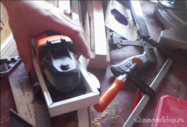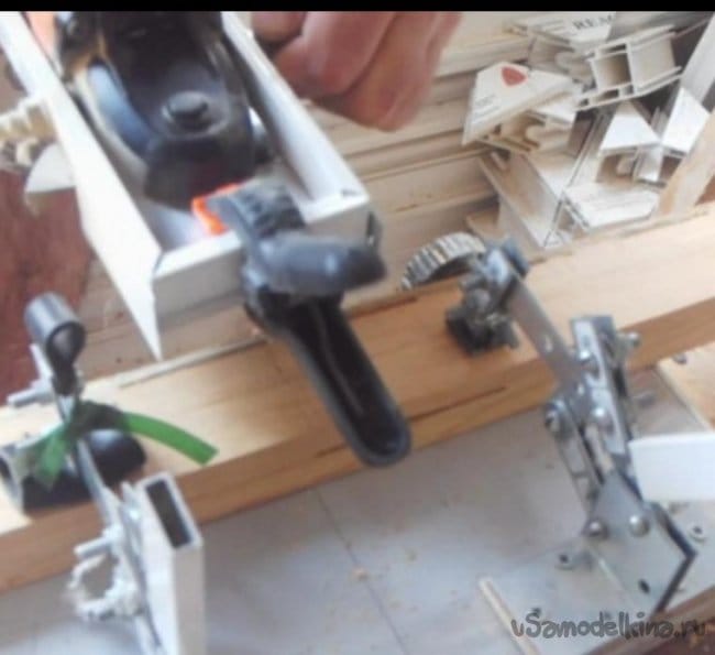 Когда я понял, что болгарку не рвет даже как обычный фрезер, то решил что любая планка прикрепленная к мой "П" образной держалке сделает свое дело, и тут как раз пригодились те "салазки" которые хотел использовать как направляющие, я их просто сложил по палам и закрепил пришепкой :)