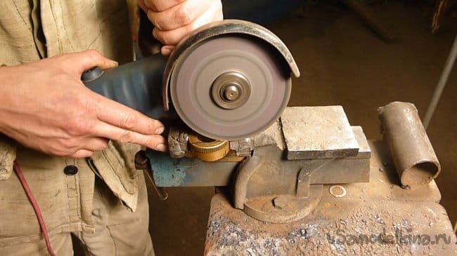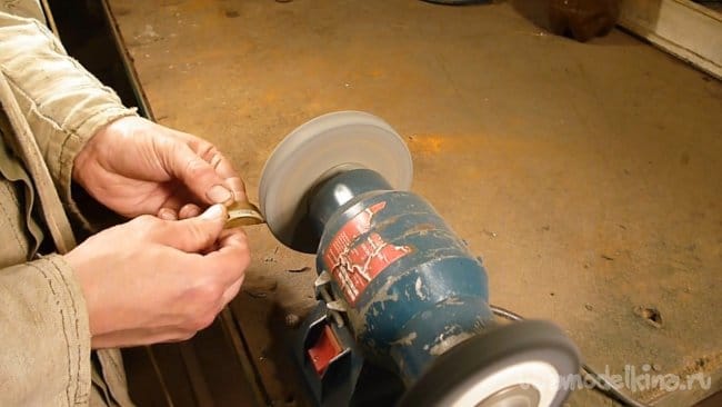 Теперь приступаем к изготовлению больстера. Для него, в закромах мастерской, нашли латунную гайку неизвестного назначения. Отрезаем от нее сегмент, обрабатываем на заточном станке и зачищаем наждачной бумагой.