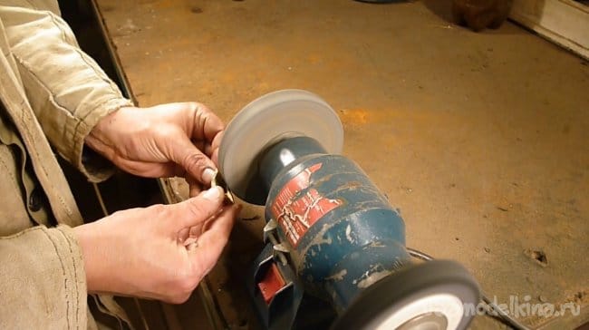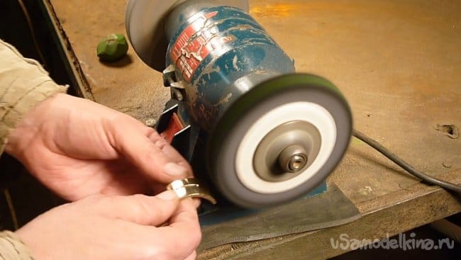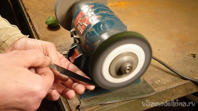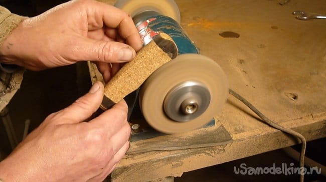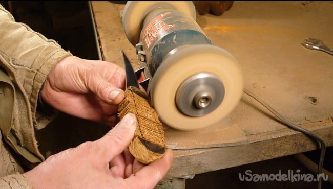 После высыхания эпоксидной смолы придаем форму рукояти на заточном станке.
