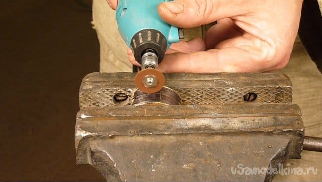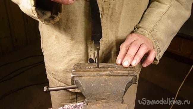 Хвостовик ножа сделаем из болта М6. Отрезаем и в торце делаем пропил для клинка.