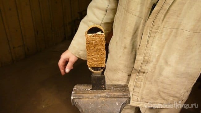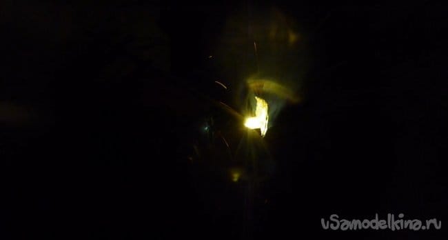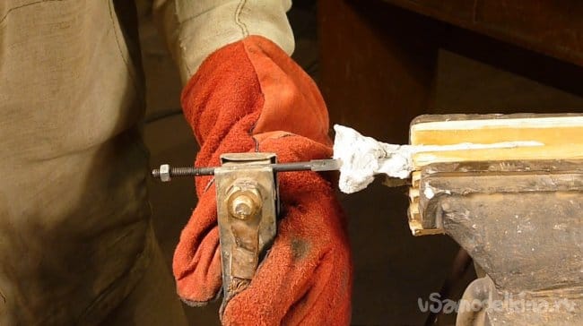 Чтобы искрами не испортить полировку закроем клинок и больстер мокрым асбестом.