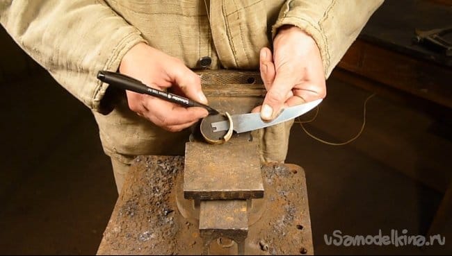 В больстере, под хвостовик клинка необходимо прорезать паз ровно по центру. Для этого маркером закрашиваем поверхность и размечаем центр штангенциркулем.