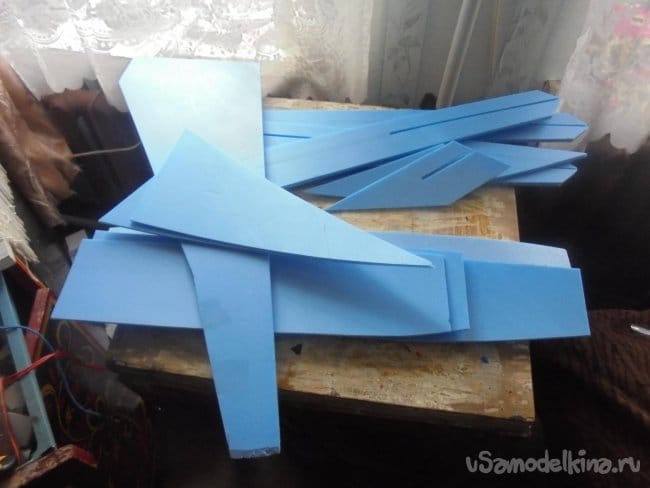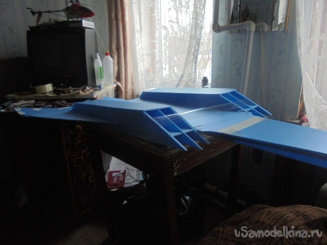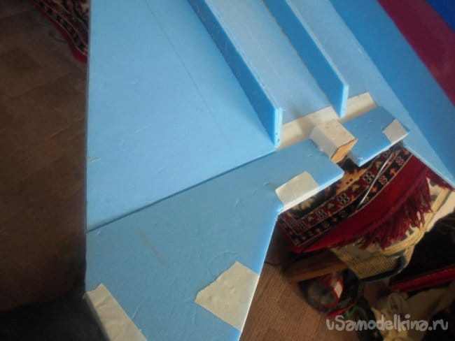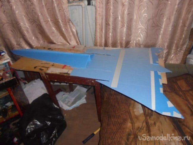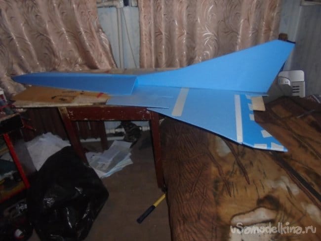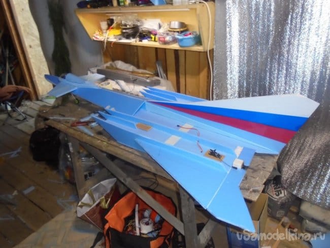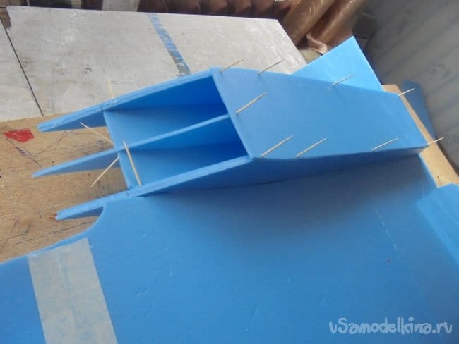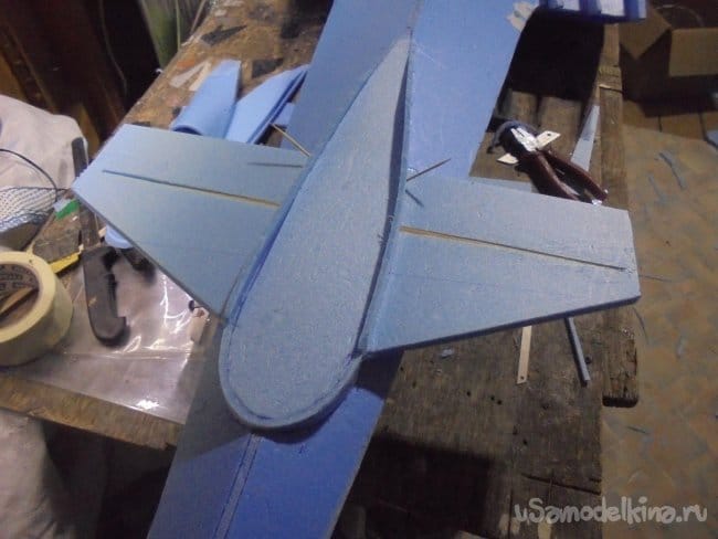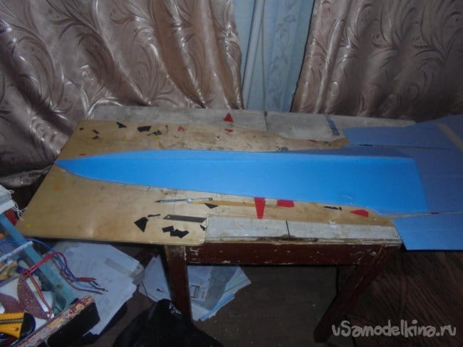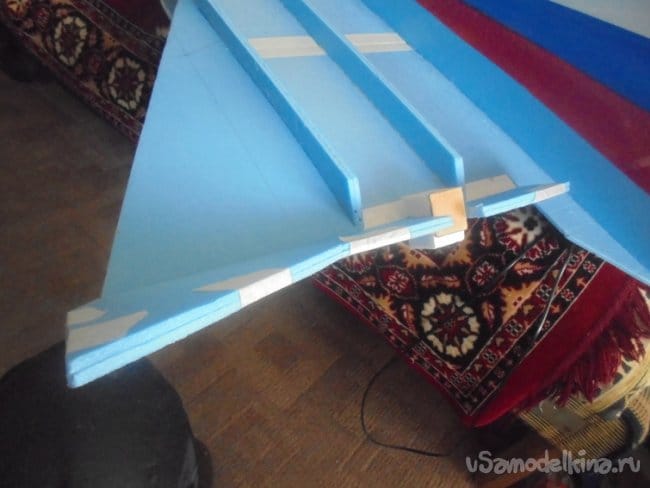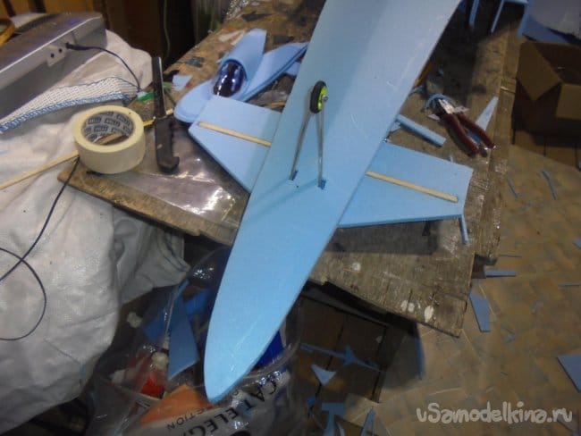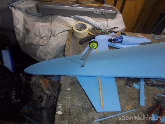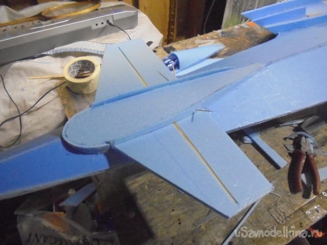 Хочу обратить ваше внимание на особенность конструкции этой модели. Моторы устанавливаются на плоскости элевонов. Для этого на элевоны монтируются вставки из пеноплекса, к которым приклеиваются кусочки оргалита, для крепления моторов.