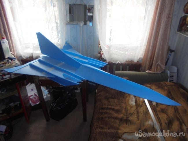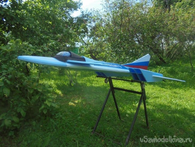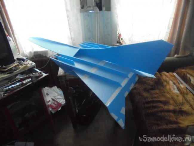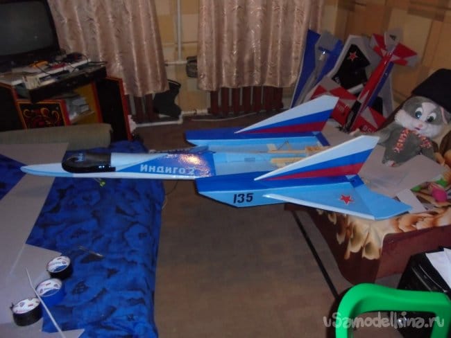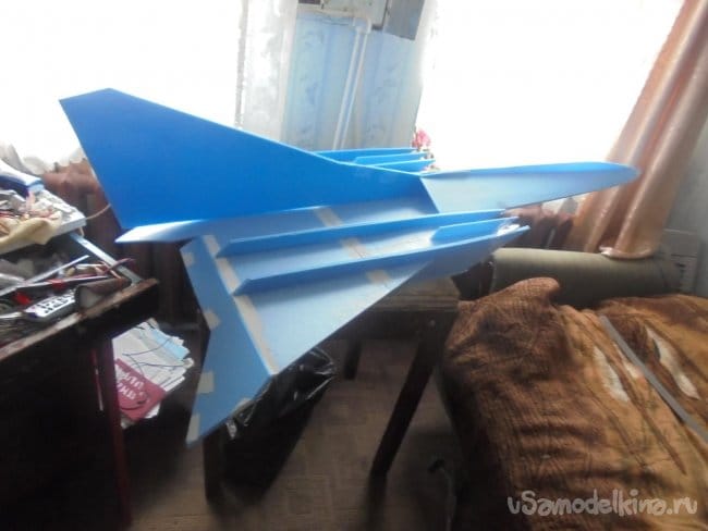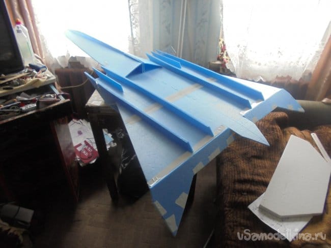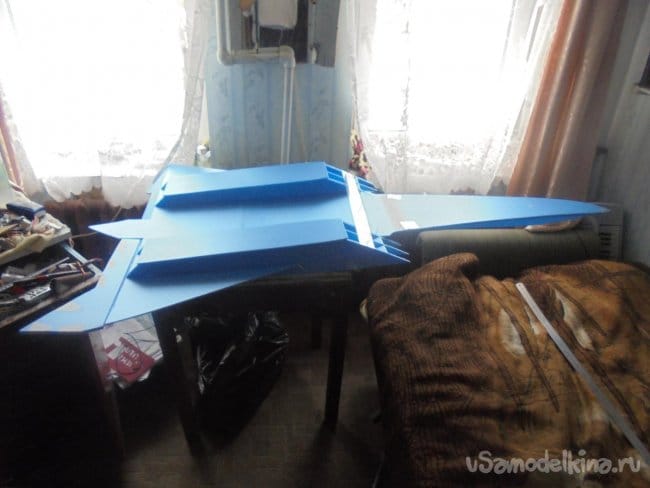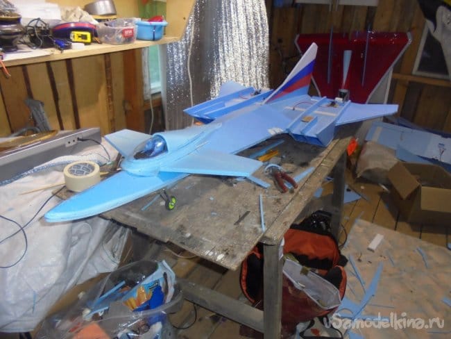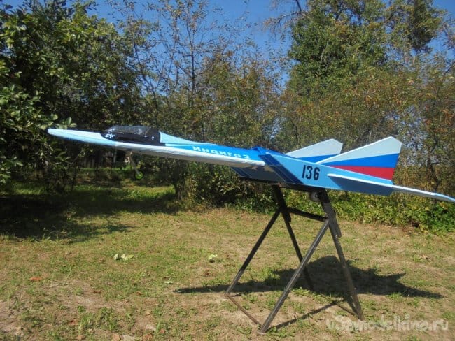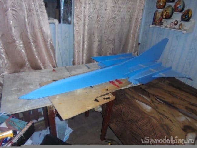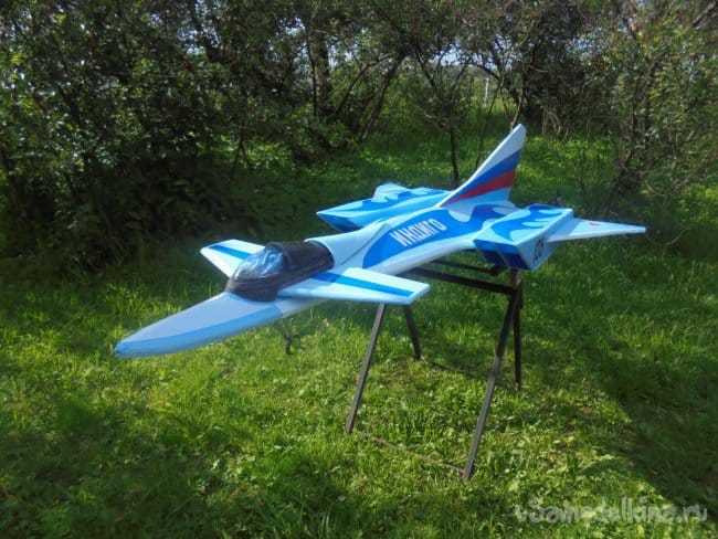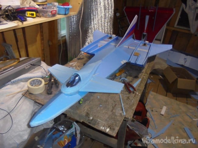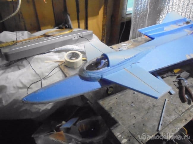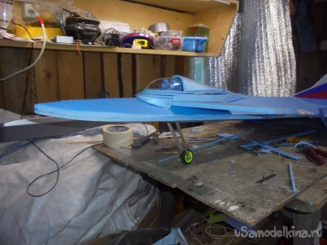 Хочу обратить ваше внимание на особенность конструкции этой модели. Моторы устанавливаются на плоскости элевонов. Для этого на элевоны монтируются вставки из пеноплекса, к которым приклеиваются кусочки оргалита, для крепления моторов.