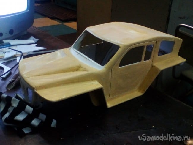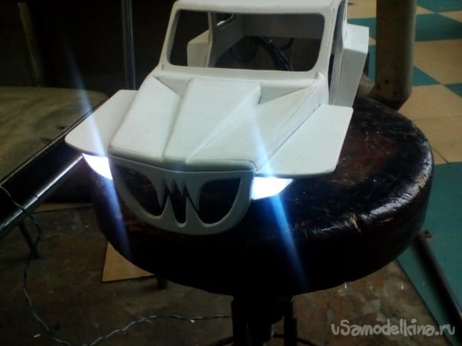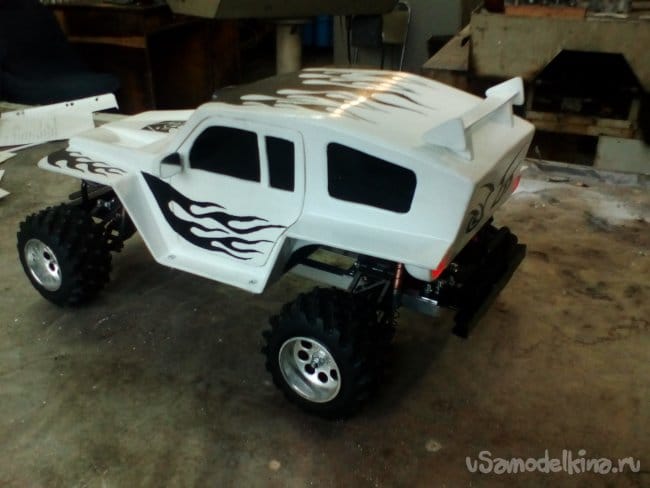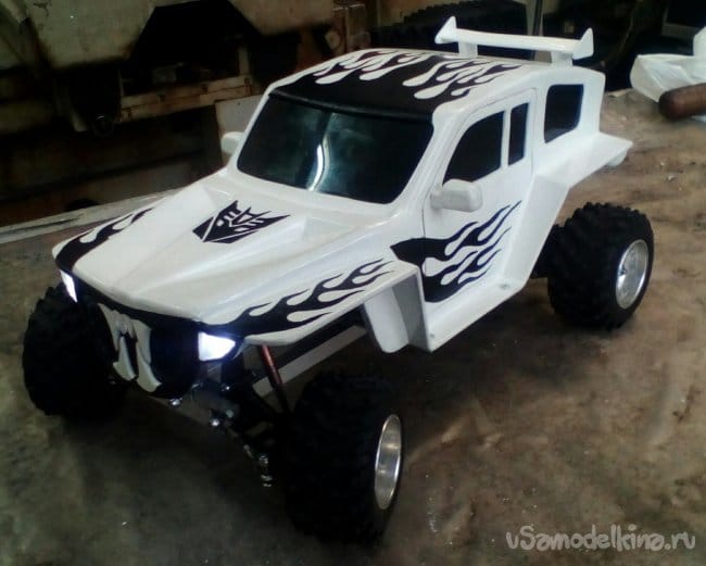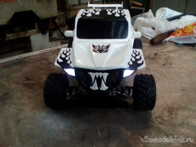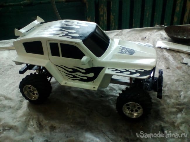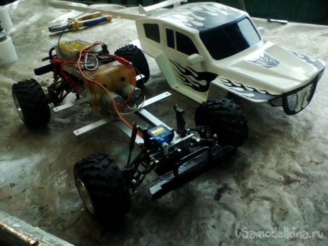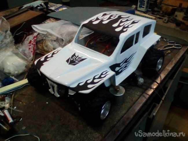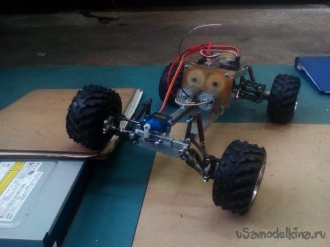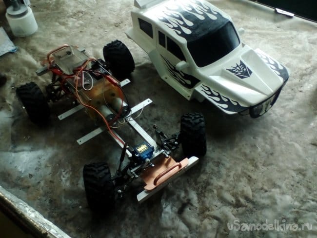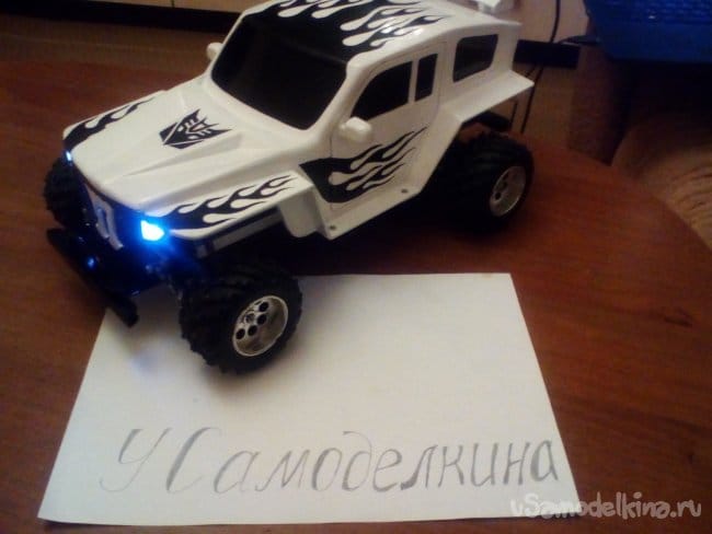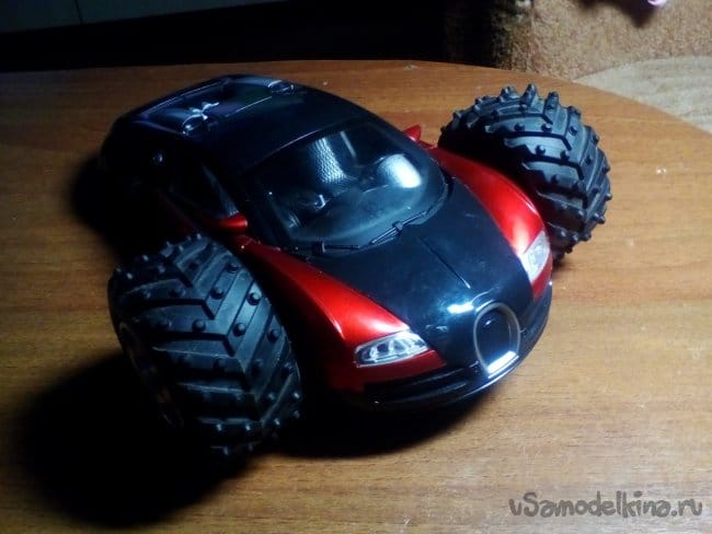 Раньше я занимался исключительно стендовыми моделями из бумаги, но побывав в очередной раз в гостях у внука, взор задержался на куче сломанных машинок, среди которых было несколько радиоуправляемых китайских. Выпросив их у него, дома распотрошил, достав моторчики, платы управления и шестеренки. Из всего этого добра родились несколько оригинальных самоделок из подручных материалов. И мне понравилось! Захотелось чего-то большего, мощного, красивого. От одного из джипов остались неплохие колеса, от другой машины кузов и родилась идея сделать бигфут.
