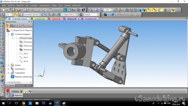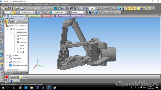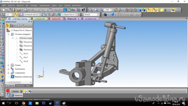 Далее пришла очередь подвесок. Пересмотрел кучу роликов по их конструкции применимо к моделям, переварил это все в голове и родились эскизы, адаптированные к тем материалам и комплектующим, которые были доступны. Чтобы не действовать методом научного тыка, решил освоить Компас. ибо создать модель на экране и исправить в ней ошибки оказалось намного легче, чем проделывать это с металлом. Подвеску сразу решил делать модульной, чтобы крепить ее к раме можно было парой винтов, и при необходимости легко менять места крепления. Вот что из этого вышло.