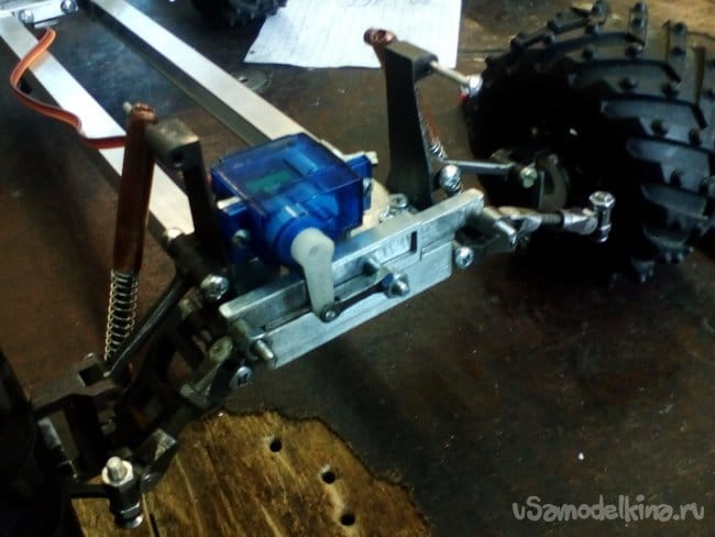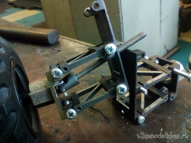 Следующий узел, с которым пришлось помучиться-рулевая система. Не буду описывать, сколько вариантов конструкции и расположения перепробовал, чтобы развал-схождение оставались неизменными при любом положении подвески, но приемлемый вариант был все же найден. Вот он: