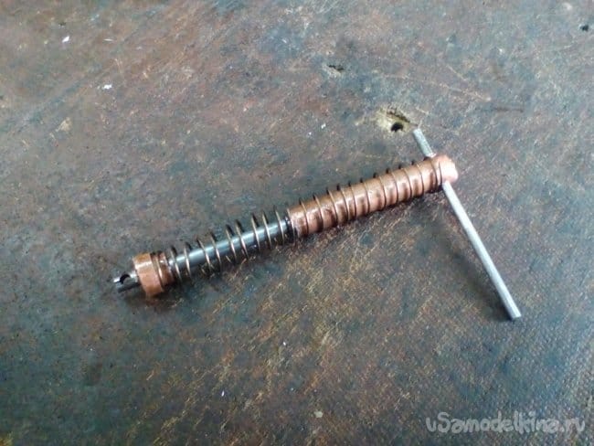Настала очередь амортизаторов. было решено сделать их из медных трубок и прутка от сварочного электрода. дополнительно вырезал ограничительные кольца на шток и упоры для пружин. вот, что получилось в итоге.
