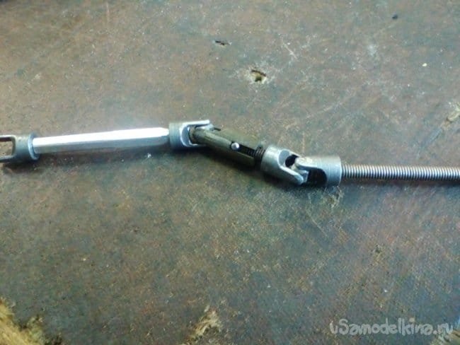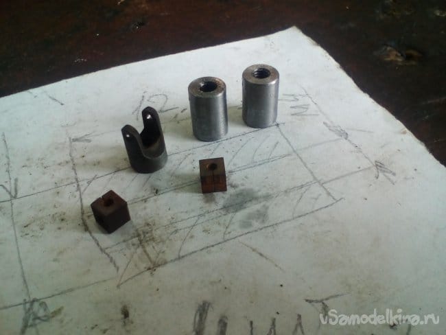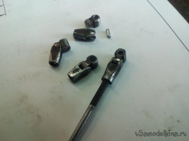 Для передачи крутящего момента на колеса решил сделать карданы. В ютубе можно найти множество способов их изготовления, мне же на помощь снова пришел мой станок. Из стальных отходов подходящих размеров нарезал детали, в качестве осей все те же велоспицы, отверстия запаял, чтоб оси не вылетали. Ход подвесок получился большим, поэтому кардан пришлось делать раздвижным.