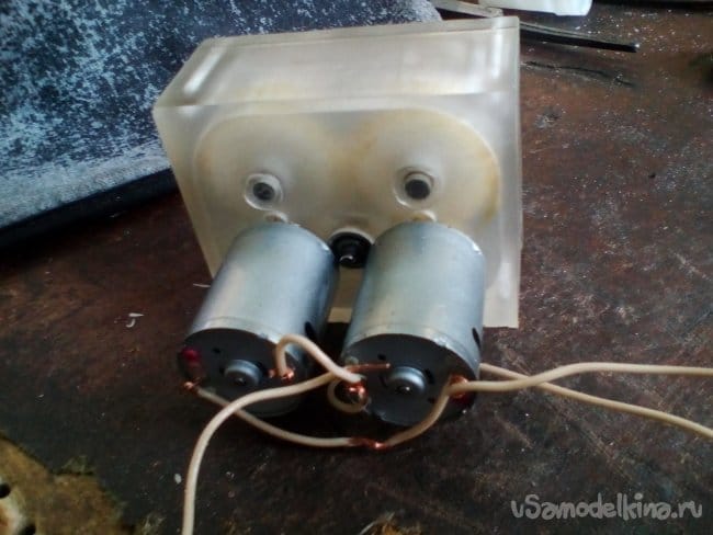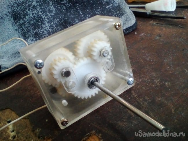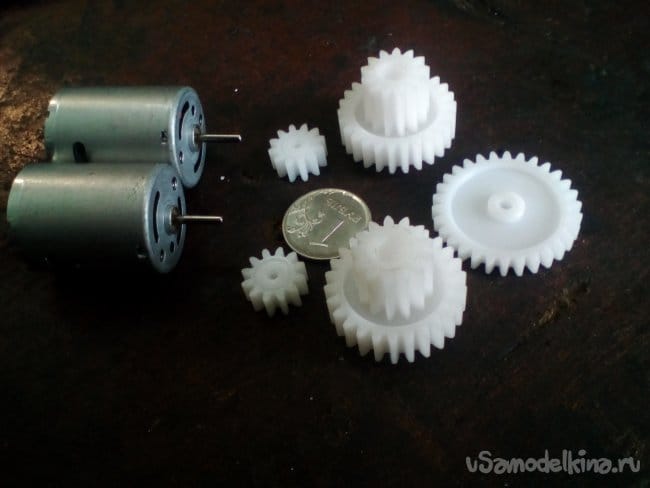 На Али выписал два мотора 370-й серии и два комплекта шестерен. Из них получился редуктор на два мотора с передаточным числом примерно 1:5.