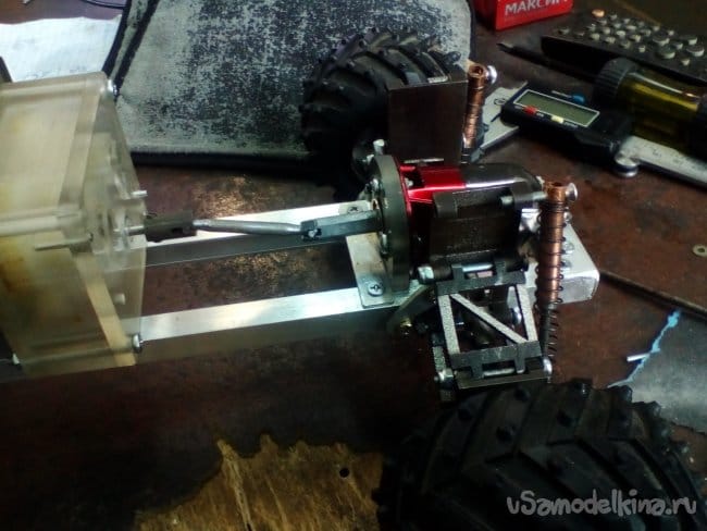 По опыту предыдущих моделей решил, что клей постараюсь исключить из ходовой части. Размеры рамы определил на глаз, исходя из размеров колес и длины предполагаемой базы. В качестве привода задних колес решил использовать рыболовную катушку, у которой сломался фрикцион. Удалил все лишнее, оставил только корпус с шестернями внутри и крепежную площадку спереди. Кусок оргстекла, кусок профиля, несколько отверстий и вот уже редуктор задней подвески на месте!