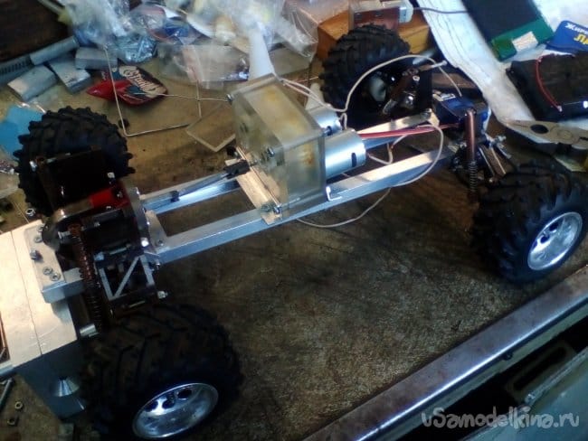 Из Г-образного профиля и куска оргстекла сделал платформу для электроники. Прикрепил ее к верхним винтам редуктора и задней подвески.