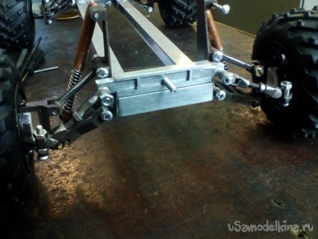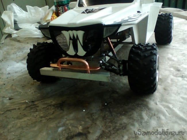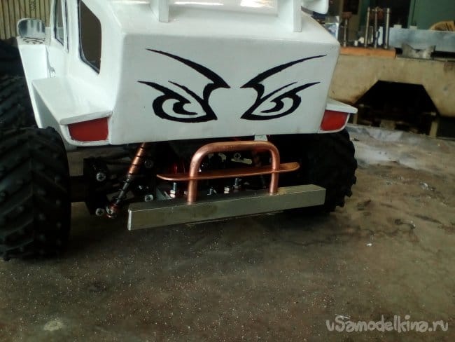 Привинтил на раму две планки и к ним прикрутил на 4 винта корпус. Из пластин гетинакса, п-образного профиля, медных пластин и трубок сделал передний и задний бампера-кенгурятники.