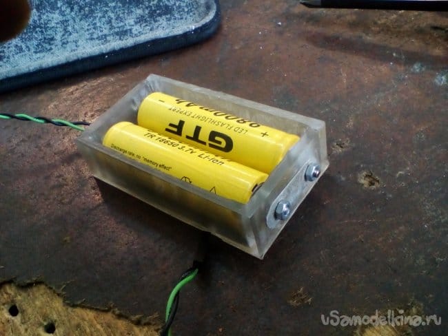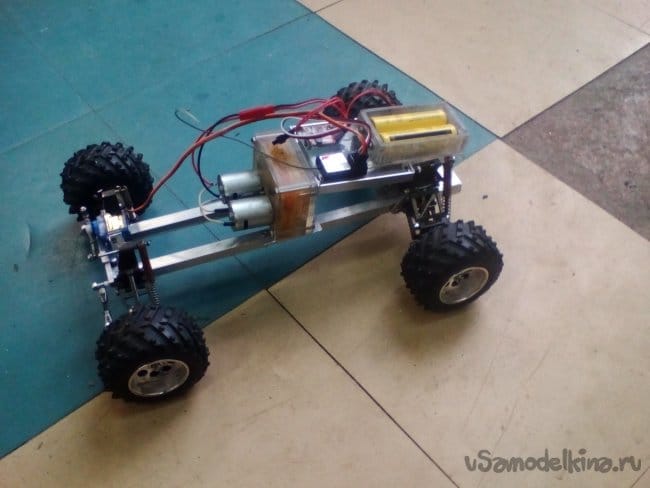 Установил на нее приемник, аккумуляторы и регулятор оборотов двигателей. Все соединил. Ходовая готова, можно испытывать!
