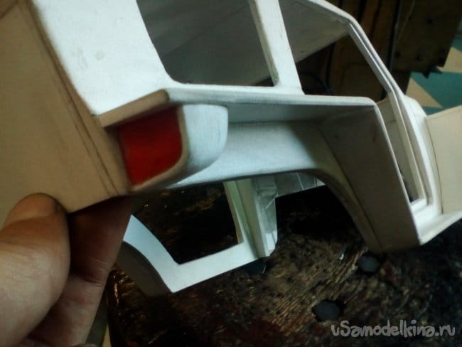 Из прозрачного пластика вырезал стекла, покрасил изнутри и вклеил на места.