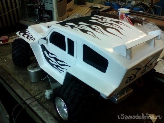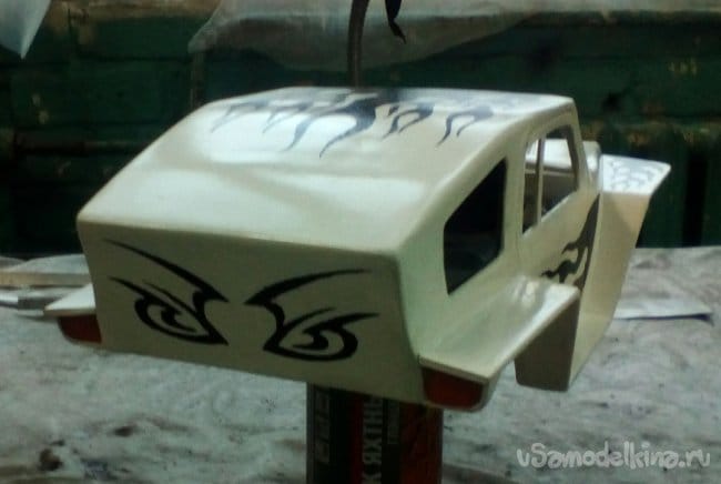 Долго и упорно выбирал рисунки на кузов. Скачал пару каталогов виниловых наклеек и выбрал на мой взгляд подходящие. Скопировал как мог на бумагу, вырезал трафареты и с помощью кисти намалевал, как сумел..