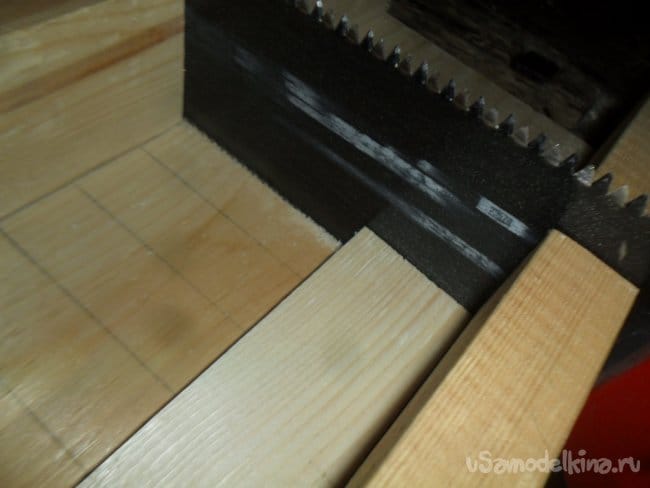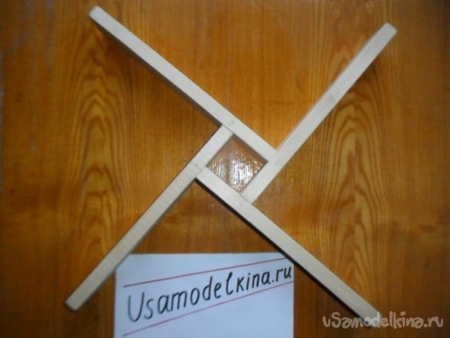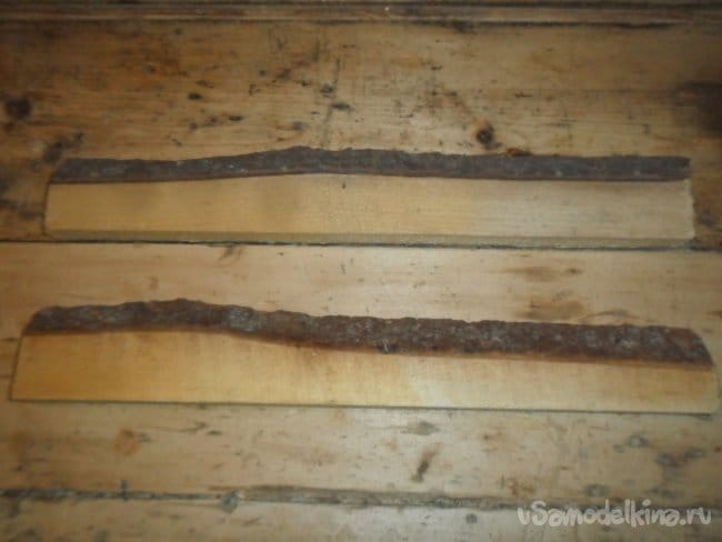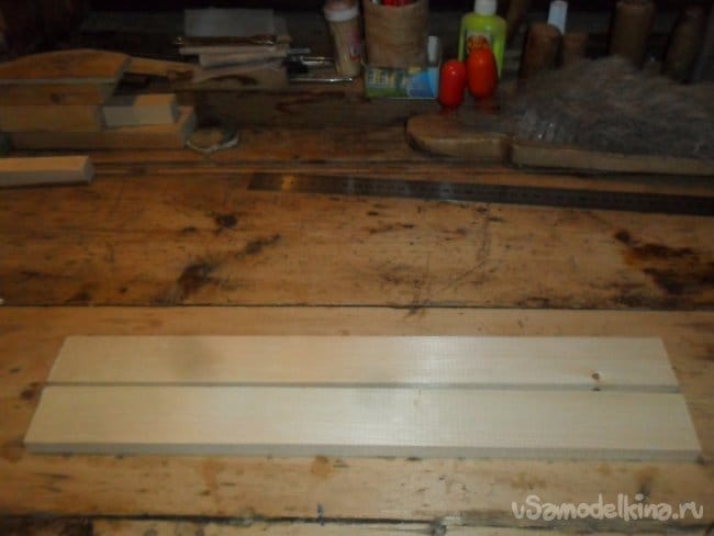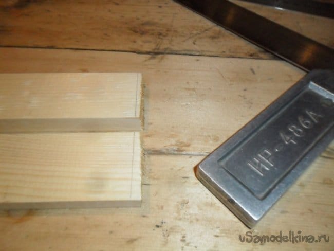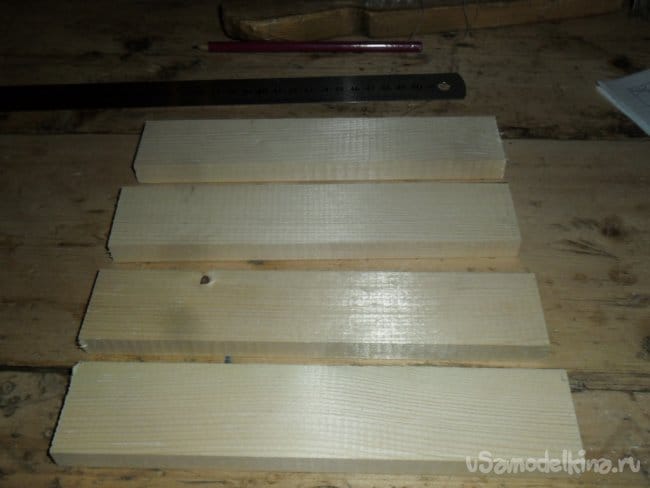 В деревянном стусле отпиливаем от реек ненужные части и распиливаем получившиеся заготовки пополам. Вышло четыре рейки длиной 20 см каждая.